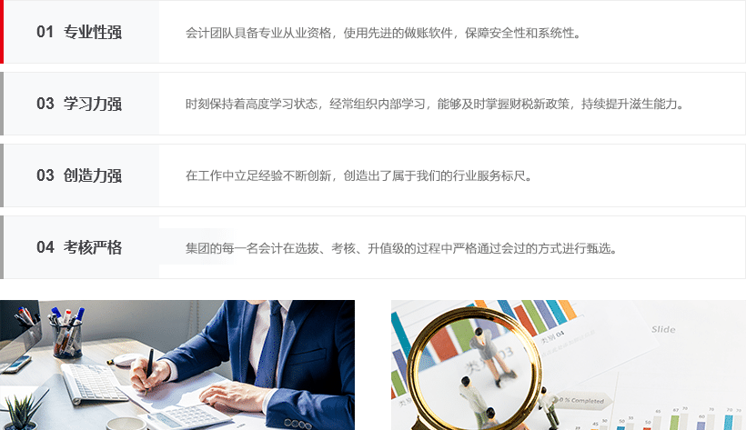 我的企業(yè)提供的財(cái)務(wù)服務(wù),都是基于多年創(chuàng)新經(jīng)驗(yàn)總結(jié)出的科學(xué)流程和做賬標(biāo)準(zhǔn),保證服務(wù)精細(xì),數(shù)據(jù)精準(zhǔn)、專(zhuān)業(yè)高效。